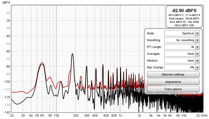 다음은 노이즈 레벨을 측정한 그래프입니다. 첫번째 싱글픽업에 대한 노이즈입니다. 60Hz 노이즈 및 이에 대한 배음이 노이즈로 측정되고 있습니다. (접지된 상태. 접지하지 않으면 이보다 노이즈가 조금 더 들어옴)