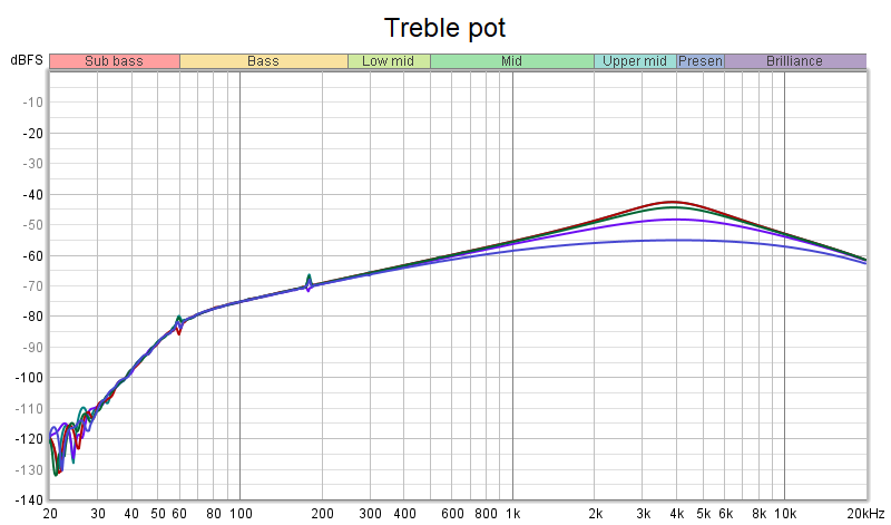 다음은 Treble POT을 조절해가며 얻은 그래프, Treble pot을 적당히 조절하여 낮추면 피크지점을 낮춰줍니다.